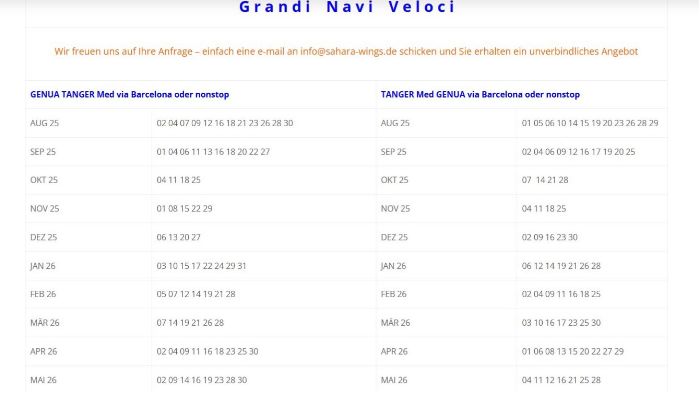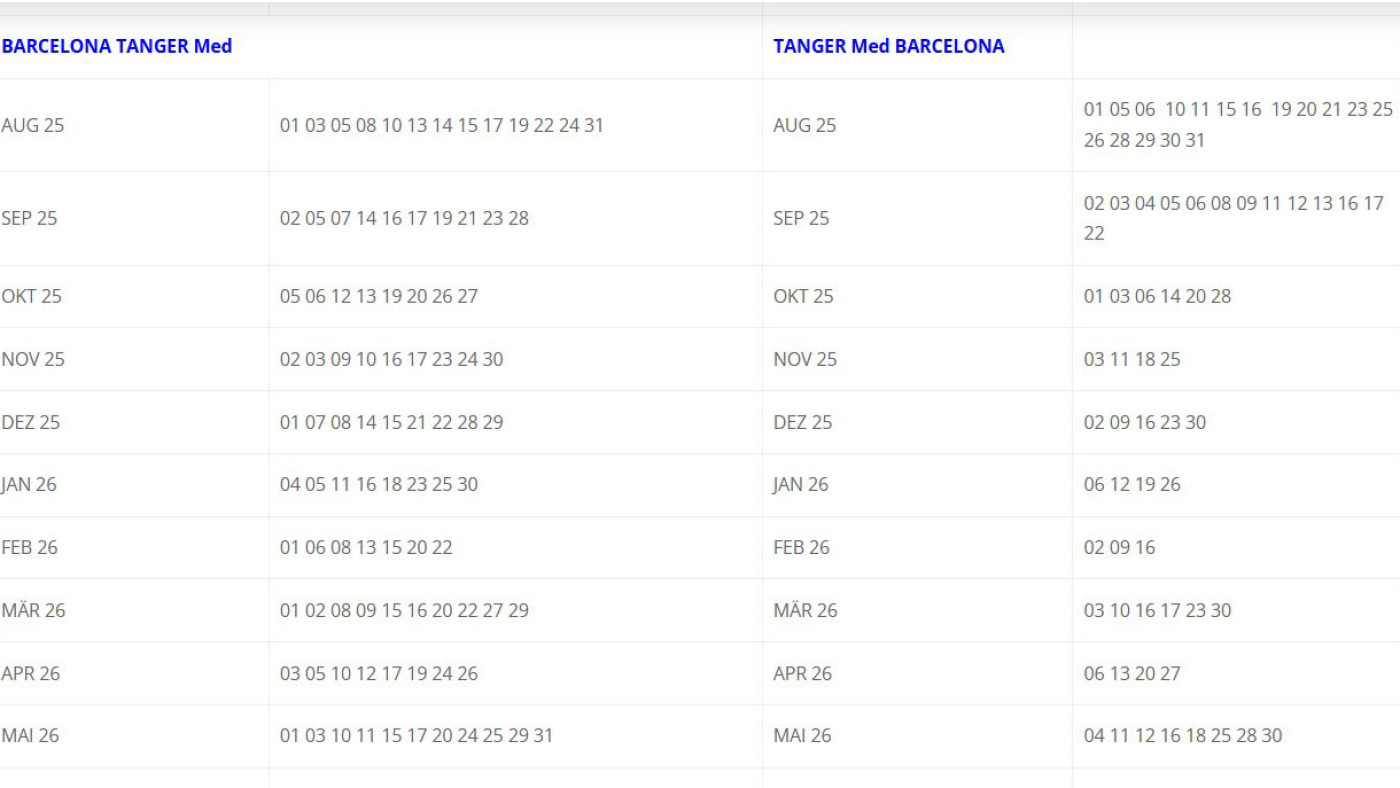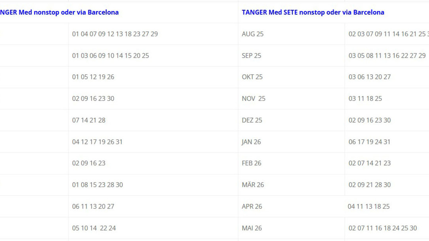 Die Fährpläne von Europa nach Marokko und zurück für 2025 uns 2026 (bis Mai) sind seit kurzem öffentlich. Wir bilden hier nur die langen Fähren von Genua, Sète und Barcelona ab. Die kurzen Fähren ab Algeciras oder Tarifa nach Nador, Ceuta oder Tanger Med fahren täglich mehrfach und müssen nicht vorgebucht werden.
