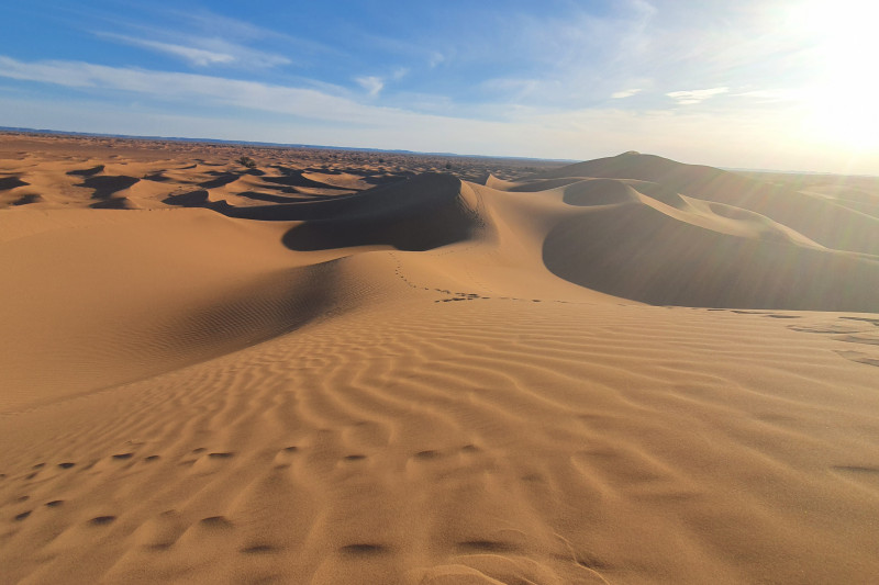 Wir überqueren den Lac Iriki und erreichen die ersten Dünen des Erg Chegaga. Hier schlagen wir unser Nachtlager in den Dünen auf.