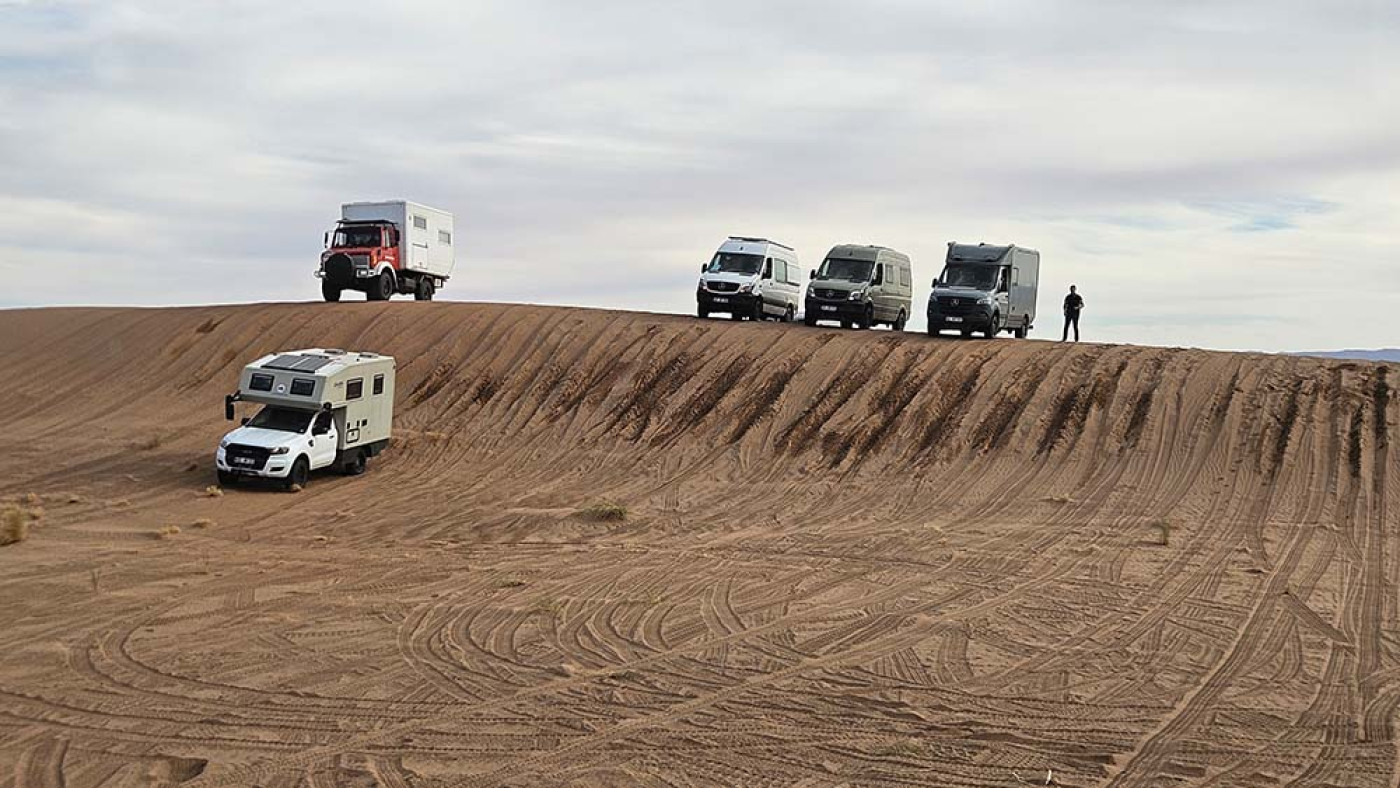 Am nächsten Morgen dehnen wir die Theorie noch etwas aus, werden ein bisschen zu Fuß in den Dünen herumkrabbeln, um den Unterschied der verschiedenen Dünenseiten zunächst mal zu Fuß zu erleben. Dann tasten wir uns mit den Fahrzeugen in den Weichsand vor und werden hier auch schnell die Unterschiede der diversen Fahrzeugkonzepte erfahren. Ebenso "mindblowing" ist die Erfahrung, im Sand mit reduziertem Luftdruck unterwegs zu sein. Hier können die Teilnehmer die Potenziale ihrer Fahrzeuge ergründen und sehen, was ein Allrad-Fahrzeug zu leisten in der Lage ist.