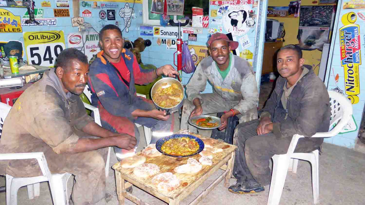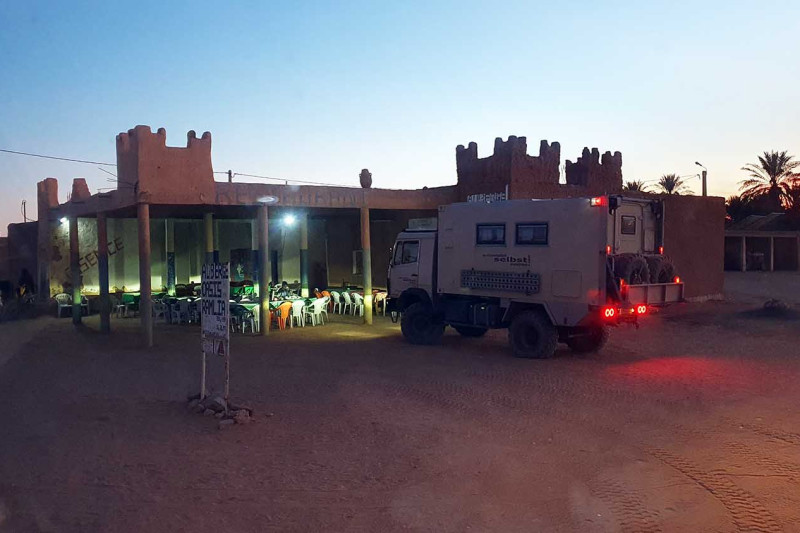 Zagora gilt als das Tor zur Sahara (wie es so viele "Tore zur Sahara" gibt). Von hier starteten früher Kamelkarawanen auf die 50-tägige Reise durch die Wüste nach Timbuktu in Mali. In Zagora gibt es die Möglichkeit, die Vorräte aufzufüllen und - falls erforderlich - an den Fahrzeugen zu schrauben oder schrauben zu lassen. Die "Garage Sahara Zagora" von Mohammed und Abdoul ist immer ein Must-Stop in Zagora - und sei es nur, um die verdreckte Karre waschen zu lassen und ggf. abzuschmieren.